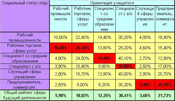 Все сферы деятельности, если следовать этой таблице, можно разделить на три «родственных» группы. Родственность заключается в том, что дети родителей, принадлежащих к какой-то сфере из этой группы, охотно переходят из сферы в сферу. Так можно объединить сферы промышленного производства и торговли, сферы услуг. Другая группа это работники сферы управления и коммерсанты. Это можно объяснить имущественном расслоением в российском обществе. Так промышленное производство не дотягивает по доходам до сферы торговли и услуг, но эти сферы далеки от сферы управления и коммерции, поэтому они и ассоциируются между собой. Особняком стоят специалисты с в/о. Подавляющее большинство детей из этих семей идут по стопам родителей.