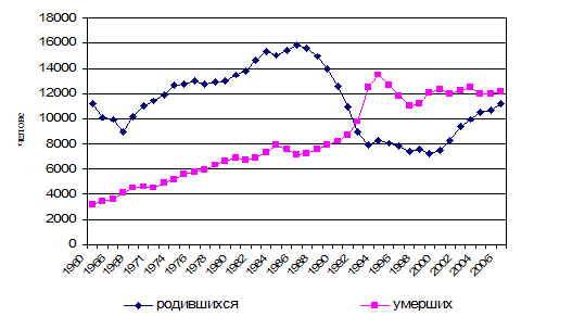 Рисунок 2. - Динамика рождаемости и смертности в г. Красноярске 1960 – 2006 гг.